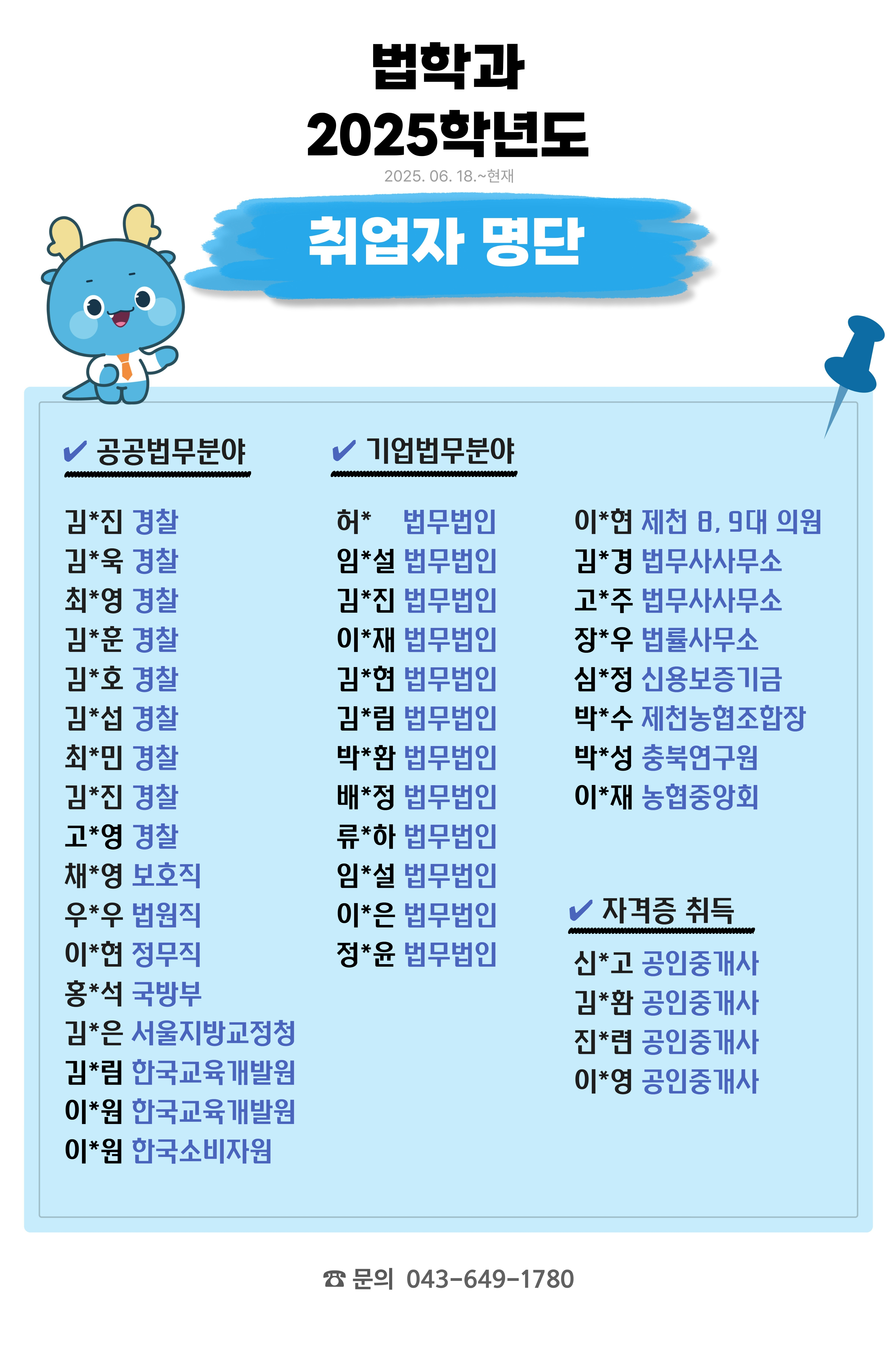 본문 시작 홈으로 커뮤니티 학과안내 교수소개 학과과정 커뮤니티 홈페이지가이드 공지사항 공지사항 취업정보 학과사진첩 학과행사 동아리 학생회 교우소식 공지사항 페이스북 트위터 프린트 법학과 2025학년도 기준 취업자 및 합격자 법학과 조회 : 628 등록일 : 2025-12-19 목록 이전❤️在学生网上评价❤️ 2025-2学期 开设讲座对象期末课程评价参与指南 다음 2025-2학기 동계방학기간 교내/교외하소아동복지관 국가근로 희망근로지 추가2차신청 안내 담당부서 : 법학과 담당자 : - 연락처 : 043-649-1764 최종수정일 : 2024-10-26 만족도조사 만족도 조사 이 페이지에서 제공하는 정보에 대하여 만족하시나요? 매우만족 만족 보통 불만족 매우불만족