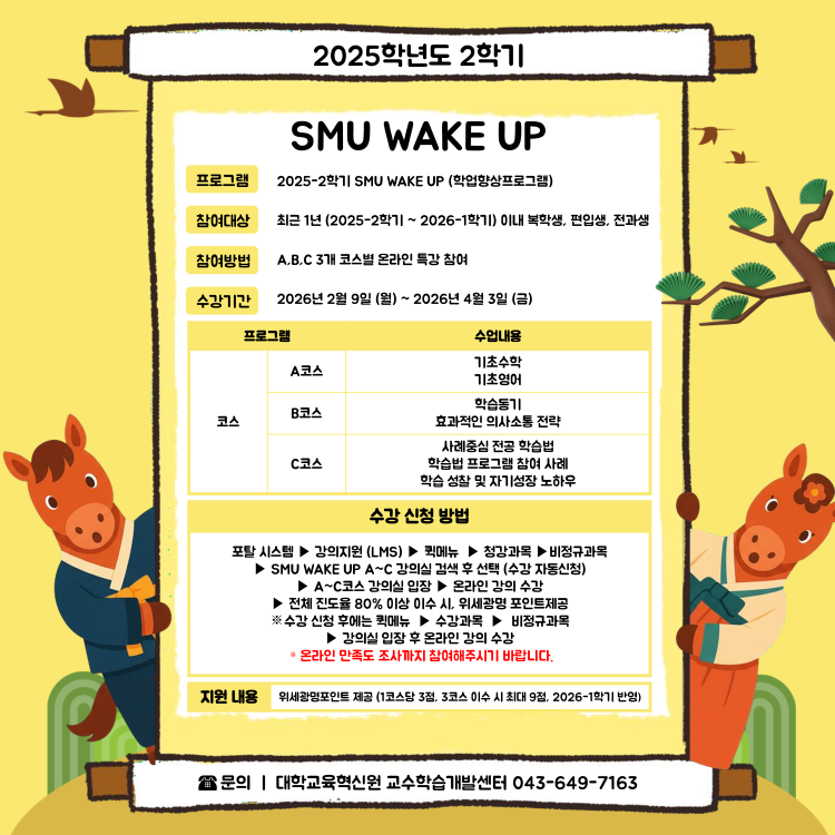 본문 시작 홈으로 커뮤니티 학과소개 학과과정 대학원 커뮤니티 연구동아리 홈페이지가이드 학과공지 학과공지 채용정보 학과일정 포토갤러리 유튜브 인스타그램 취업현황 학생회 조직도 졸업생 숏터뷰 학과공지 페이스북 트위터 프린트 2025학년도 2학기 SMU WAKE UP 홍보물 바이오코스메틱학과 조회 : 42 등록일 : 2026-03-19 목록 이전2026학년도 학생 대상 학습역량진단 홍보물 담당부서 : 바이오코스메틱학과 담당자 : - 연락처 : 043-649-1638 최종수정일 : 2024-10-26 만족도조사 만족도 조사 이 페이지에서 제공하는 정보에 대하여 만족하시나요? 매우만족 만족 보통 불만족 매우불만족