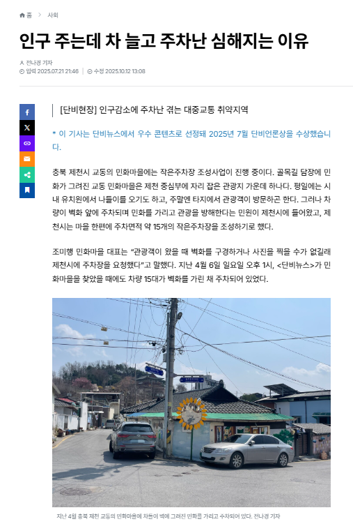 단비언론상 첫 번째 수상작은 전나경 기자님이 보도하신 <인구 주는데 차 늘고 주차난 심해지는 이유>입니다!