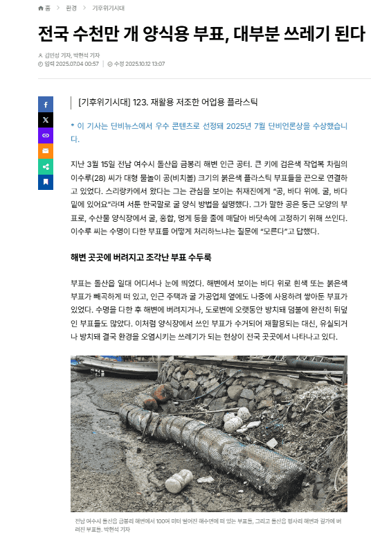 김민성, 박현석 기자님께서 보도하신 <전국 수천만 개 양식용 부표, 대부분 쓰레기 된다>입니다!