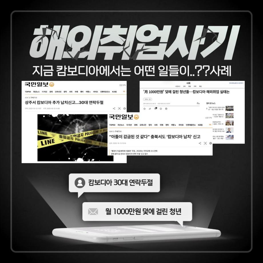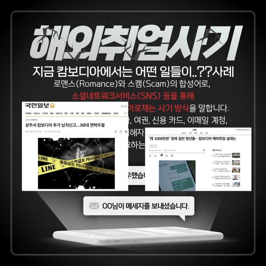 본문 시작 홈으로 커뮤니티 학과소개 교수소개 학과과정 커뮤니티 홈페이지가이드 포토갤러리 학부공지 학과일정 포토갤러리 학생회 동아리 포토갤러리 페이스북 트위터 프린트 해외 취업사기 범죄예방교육 경찰학과 124 2025-10-20 안녕하세요 세명대학교 경찰학과 입니다. 최근 이슈가 되고있는 해외취업사기 관련카드뉴스 입니다. 목록 이전상담받고GO! 쿠폰받GO! 무료로 대학 지원하GO! 만족도조사 만족도 조사 이 페이지에서 제공하는 정보에 대하여 만족하시나요? 매우만족 만족 보통 불만족 매우불만족