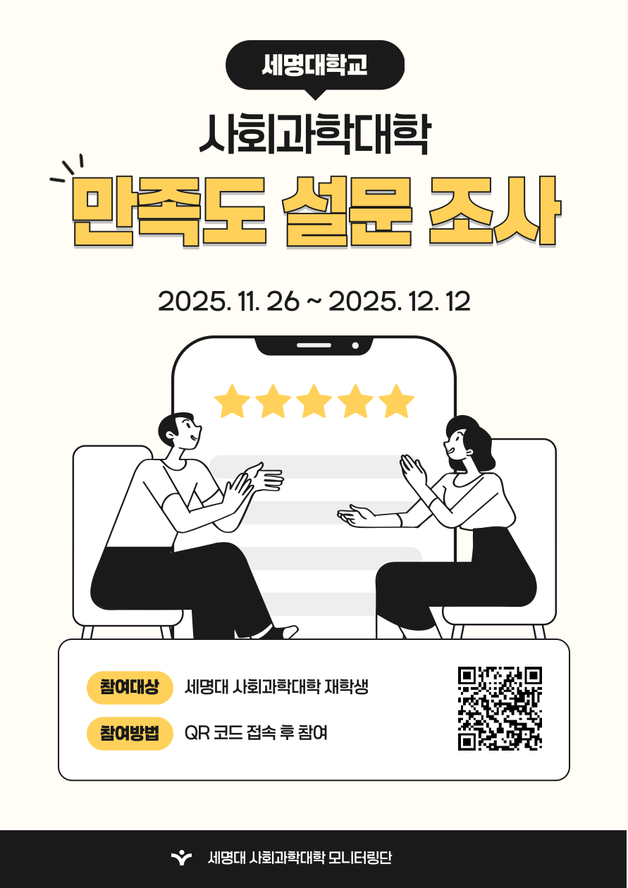 경찰학과가 소속된 사회과학대학에서 모니터링단 설문조사를 실시한다고 하니 학생 여러분들의 많은 참여 부탁드립니다.