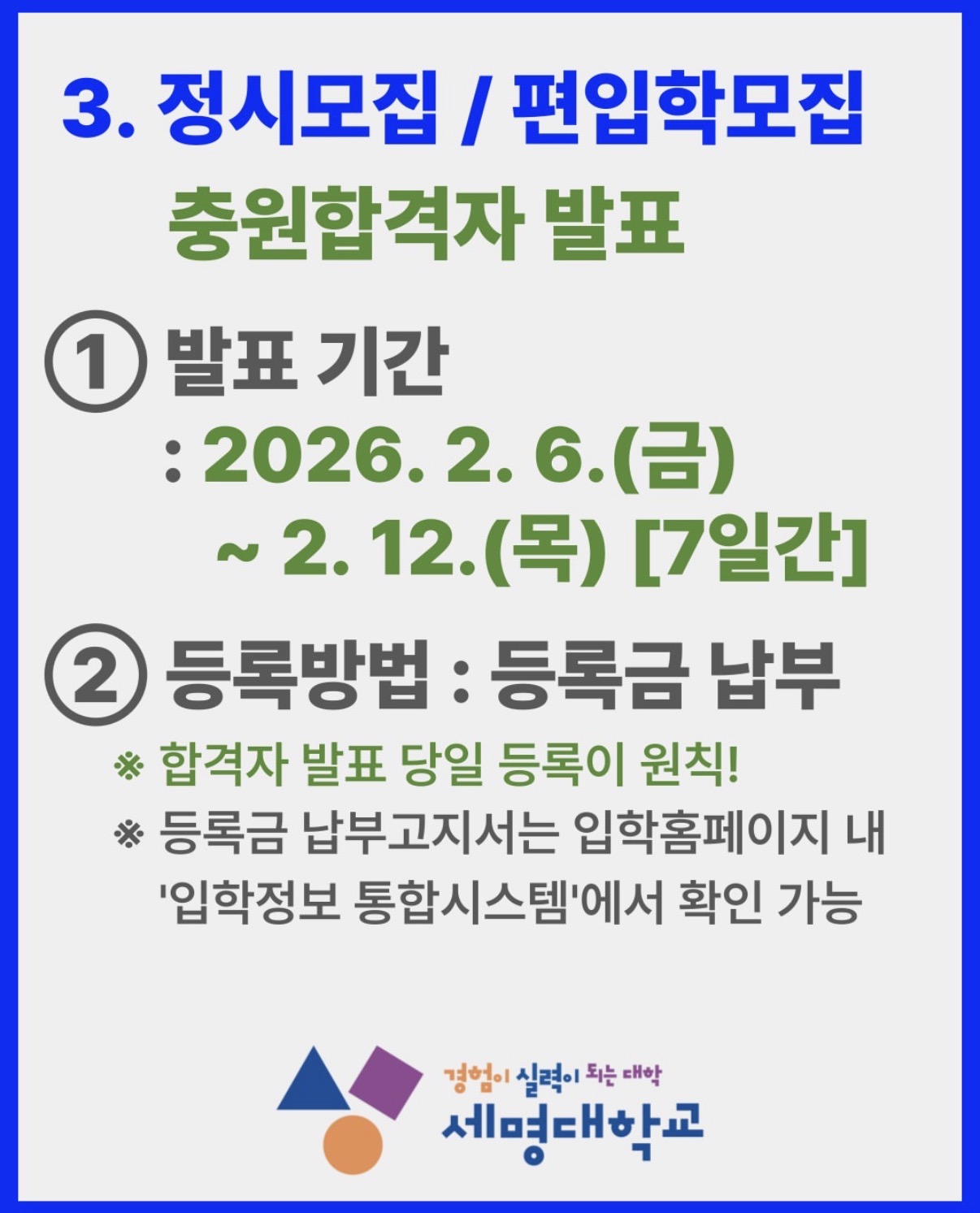 ② 최초합격자 등록기간 : 2026. 2. 3.(화) 09:00 ~ 2. 5.(목) 16:00 까지