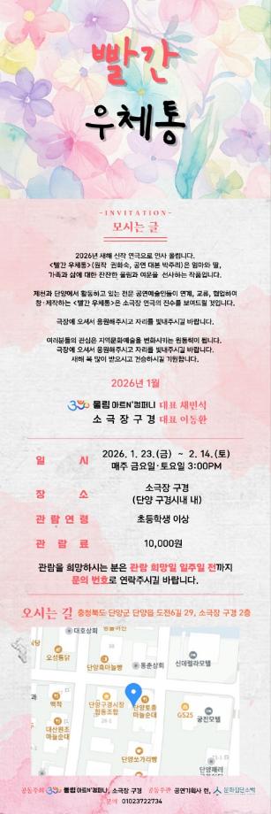 본문 시작 홈으로 MCC News 학과소개 교수소개 학과과정 MCC News MCC SNS 홈페이지가이드 교수 및 졸업생 학과 및 재학생 교수 및 졸업생 미디어 정보통 교수 및 졸업생 페이스북 트위터 프린트 권화숙 교수님 희곡 빨간우체통 공연 안내 미디어콘텐츠창작학과 943 2026-01-16 권화숙 교수님께서 작성하신 희곡 작품 '빨간우체통'이 연극무대에 올려지게 되었습니다. 자세한 내용은 위 사진을 참고해주시면 됩니다. 목록 이전권화숙 교수님 향기로운 삶, 문인화 전시회 안내 담당부서 : 미디어콘텐츠창작학과 담당자 : - 연락처 : 043-649-1741 최종수정일 : 2024-10-26 만족도조사 만족도 조사 이 페이지에서 제공하는 정보에 대하여 만족하시나요? 매우만족 만족 보통 불만족 매우불만족