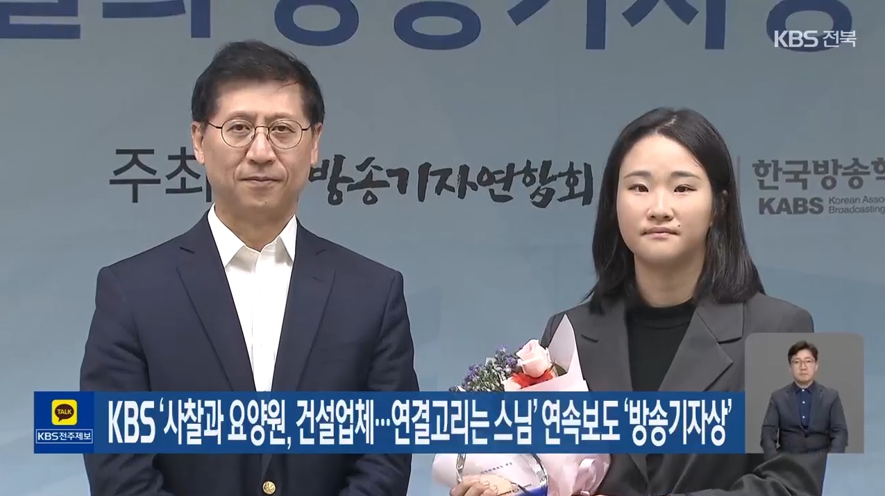 KBS 전주방송총국 김현주(세저리 13기) 기자가 '사찰과 요양원, 건설업체…연결 고리는 스님'(김현주, 한문현 기자) 보도로 방송기자연합회 제203회 이달의 방송기자상 시상식에서 지역 취재 보도 부문 상을 받았습니다. 이 보도는 군산 한 요양원의 갑질과 불법 도청 의혹 등 내부 고발과 증언을 바탕으로 한 스님과 관련한 국가 보조금 횡령과 비자금 조성 의혹 등을 고발했습니다. 심사위원들은 요양원 직원들에 대한 불법도청 의혹에서 출발해 사찰과 요양원, 건설업체, 지역 종교계까지 이어지는 구조적 문제점을 짚어낸 점이 인상적이었다고 평가했습니다. 김현주 기자는 "어렵게 낸 용기가 좌절로 끝나지 않기를 바란다"며 "이 상이 어려운 시간을 겪고 있는 요양원 직원들에게 작은 위로가 됐으면 좋겠다"고 소감을 밝혔습니다.